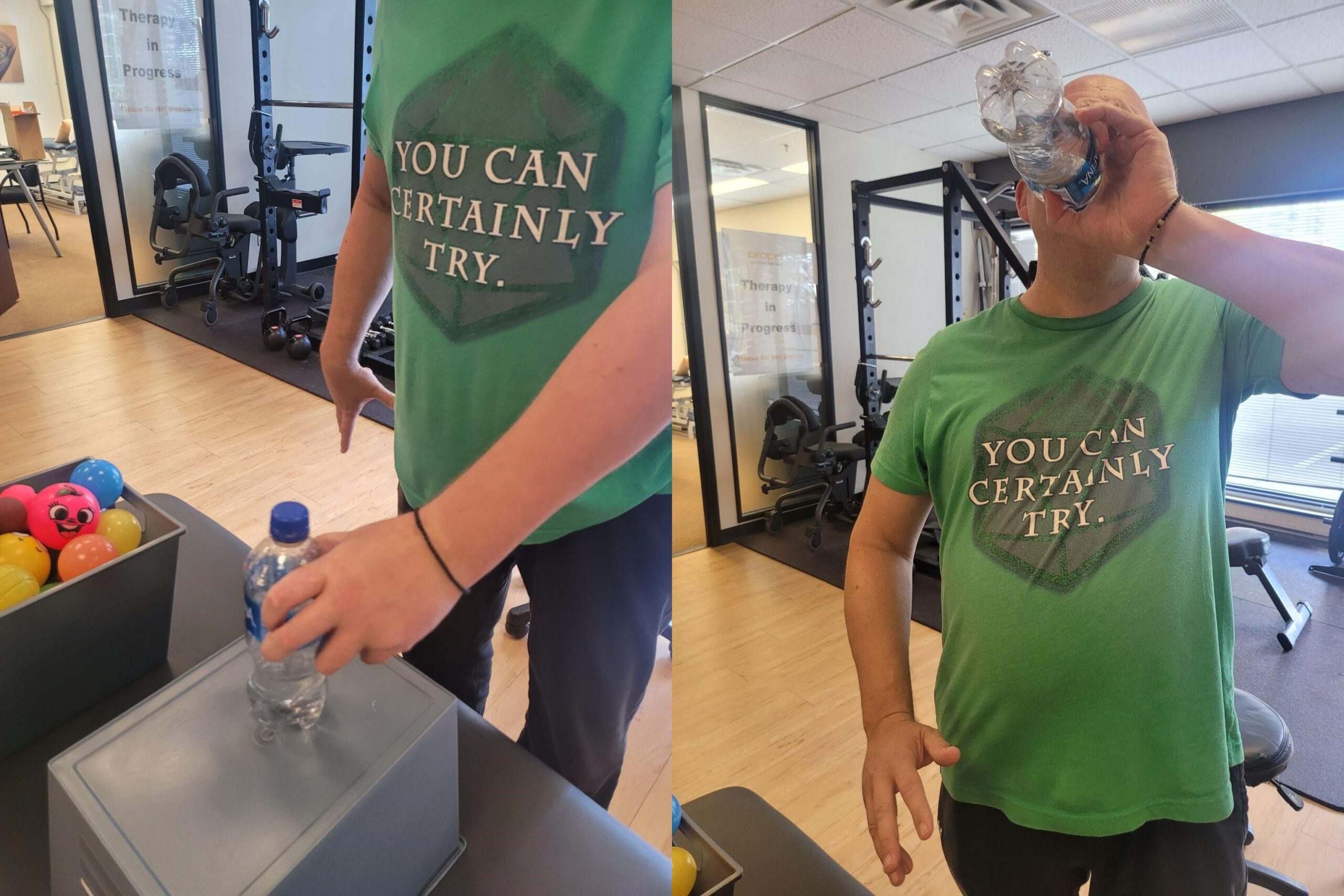 Chris is now also able to place his hands on a bottle of water! Furthermore, he is able to walk short distances independently in his home and feels more confident with using his cane or rollator walker less.
