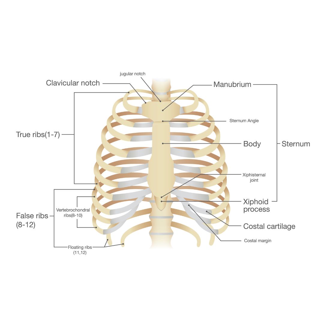 Fractures of the 4th-10th ribs are the most common due to their location and structure within the ribcage. They are weaker where they bend, and are more exposed, making them the most susceptible to fracture and account for 50-60% of all rib fractures. Ribs 1-3 are protected by the shoulder blade and collar bone, requiring high-energy trauma to break, and ribs 11 and 12 (the “floating ribs”) are more flexible and able to absorb force making them less likely to fracture.