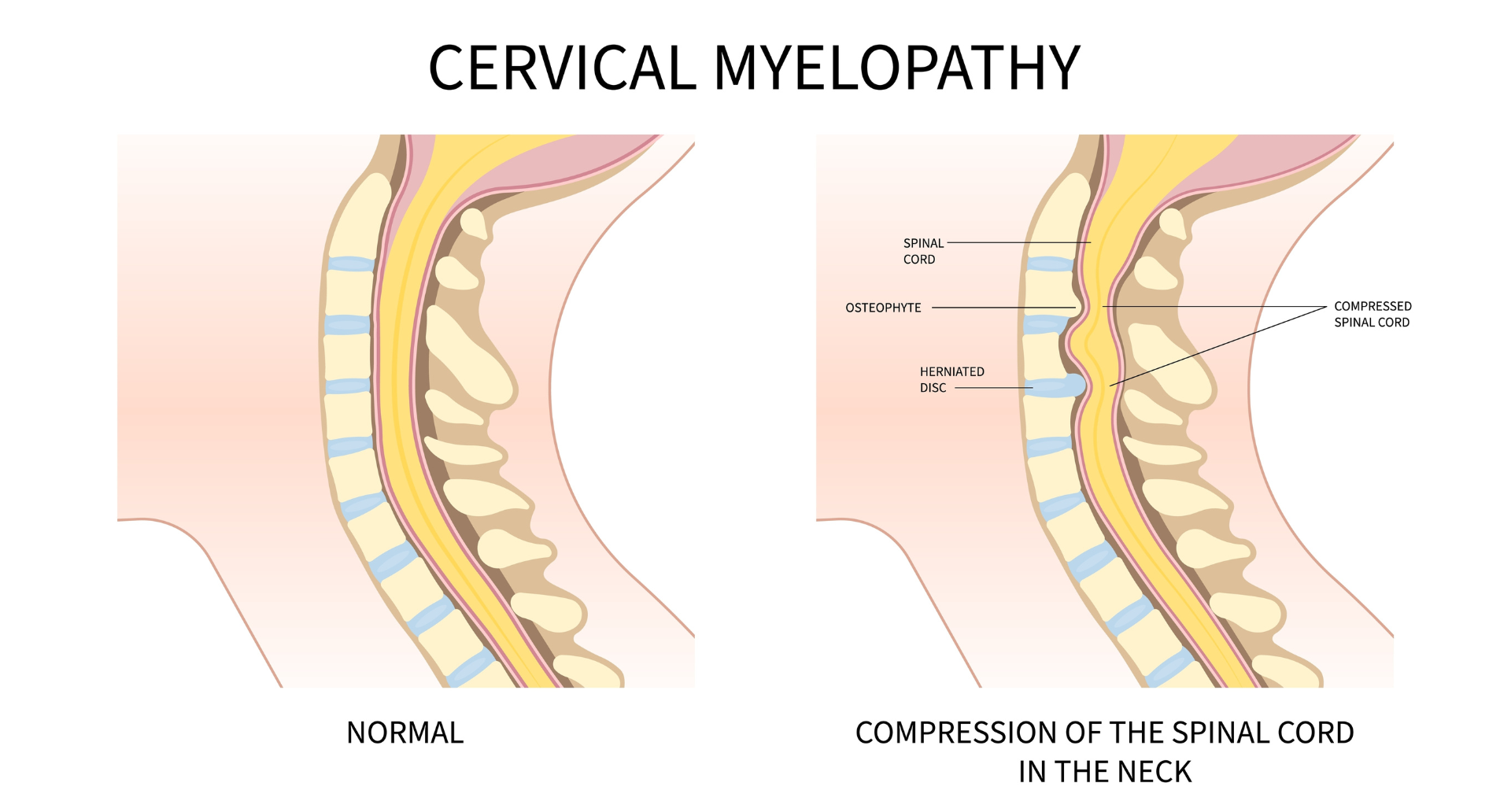 Spine with degenerative cervical myelopathy versus normal spine. Degenerative cervical myelopathy treatment at Propel Physiotherapy.